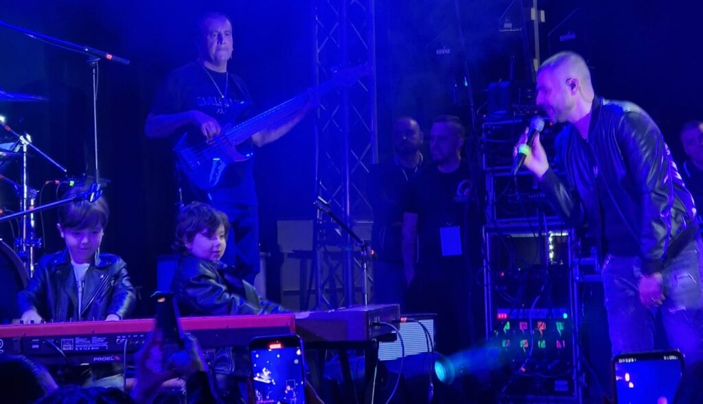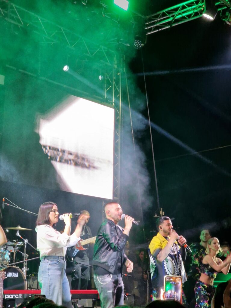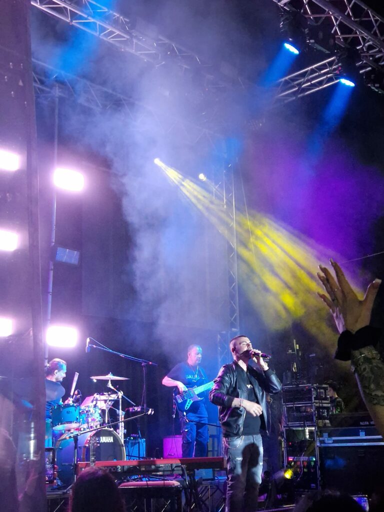 Il concerto è iniziato verso le 22:30. Il cantante ha cantato diversi dei suoi brani più famosi, tra cui “Che si’” e “Voglio parlà cu tte”. Molto apprezzata anche la voce femminile che ha aperto la serata, il cui vestito rosso contrastava con la bellissima batteria color acquamarina della band.