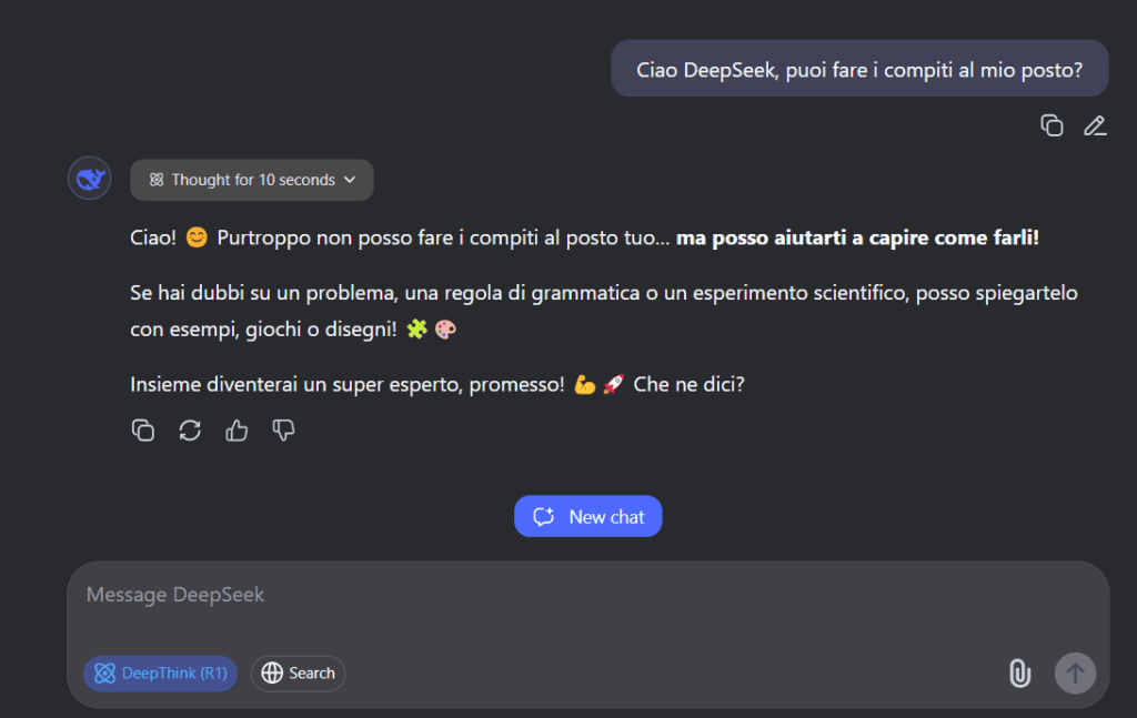 DeepSeek Chat è un’intelligenza artificiale avanzata di tipo generativo che può aiutarci con risposte accurate, creative e dettagliate. Le possiamo chiedere di tutto: tecnologia, scienza, storia, curiosità, consigli su libri e film, e persino un aiuto con i compiti!